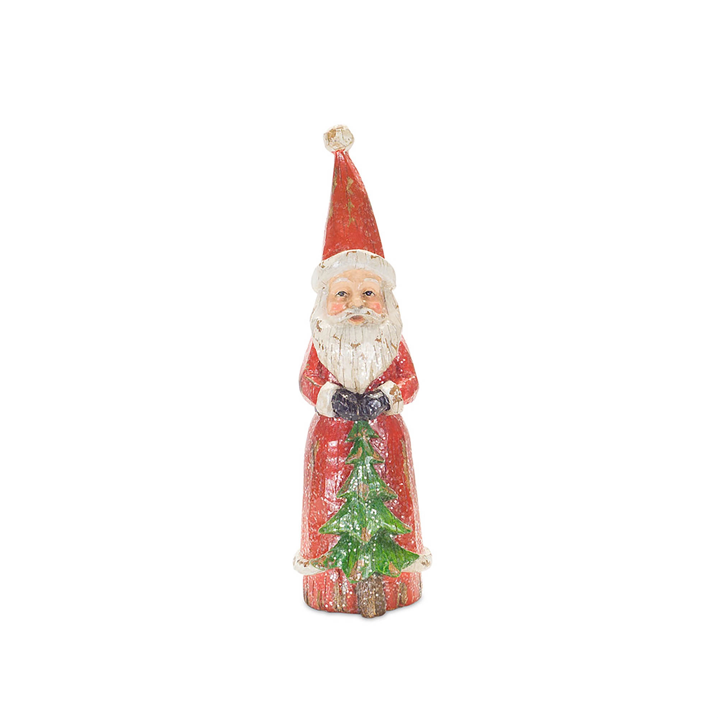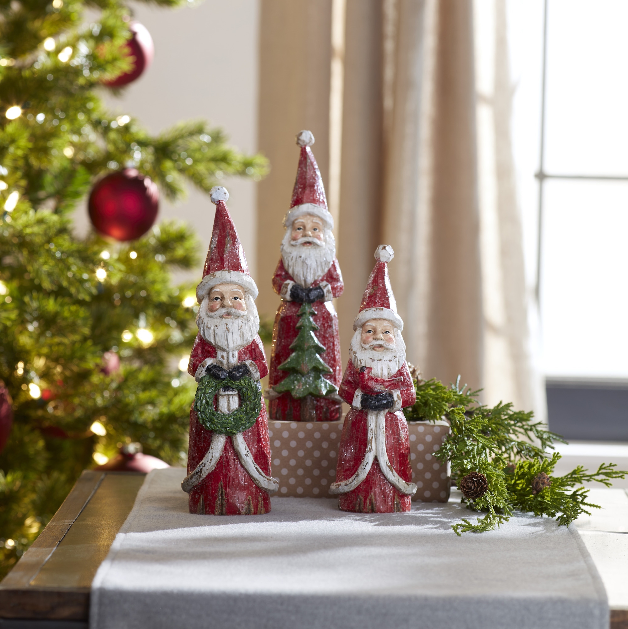 Celebrate the season with these charming Distressed Wood Design Santa Figurines. This delightful set of three showcases Santa in various poses, each holding a festive wreath, pine tree, or cardinal bird. Crafted from high-quality polyresin with a timeless weathered finish, these Santas add a cheerful touch to any holiday display. With a bold color palette of red, green, and white, they bring the spirit of Christmas to life. Perfect for showcasing together or spreading throughout your home, these Santas are sure to make a lasting impression for years to come. Sold in a set of three assorted sizes to make a statement in your home.