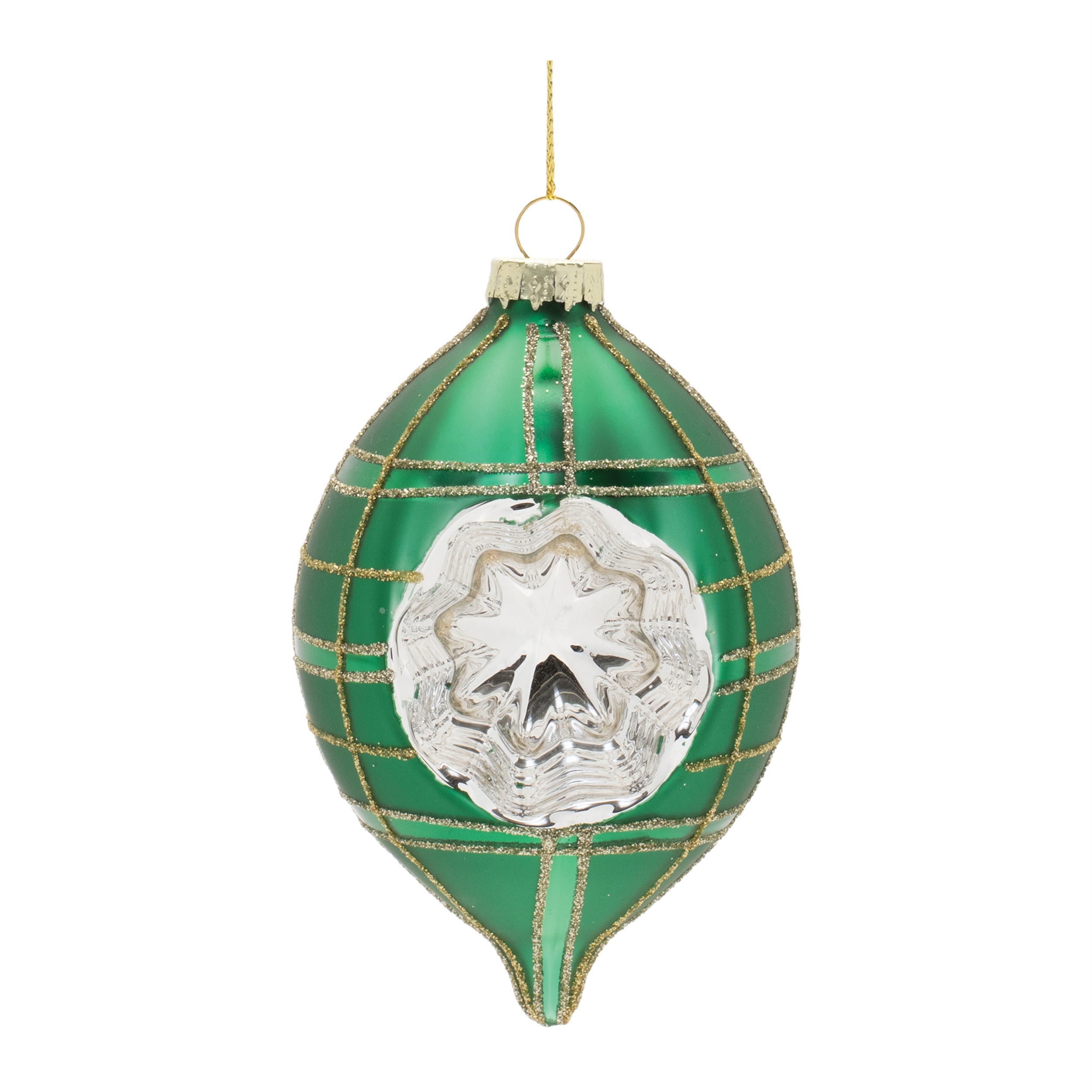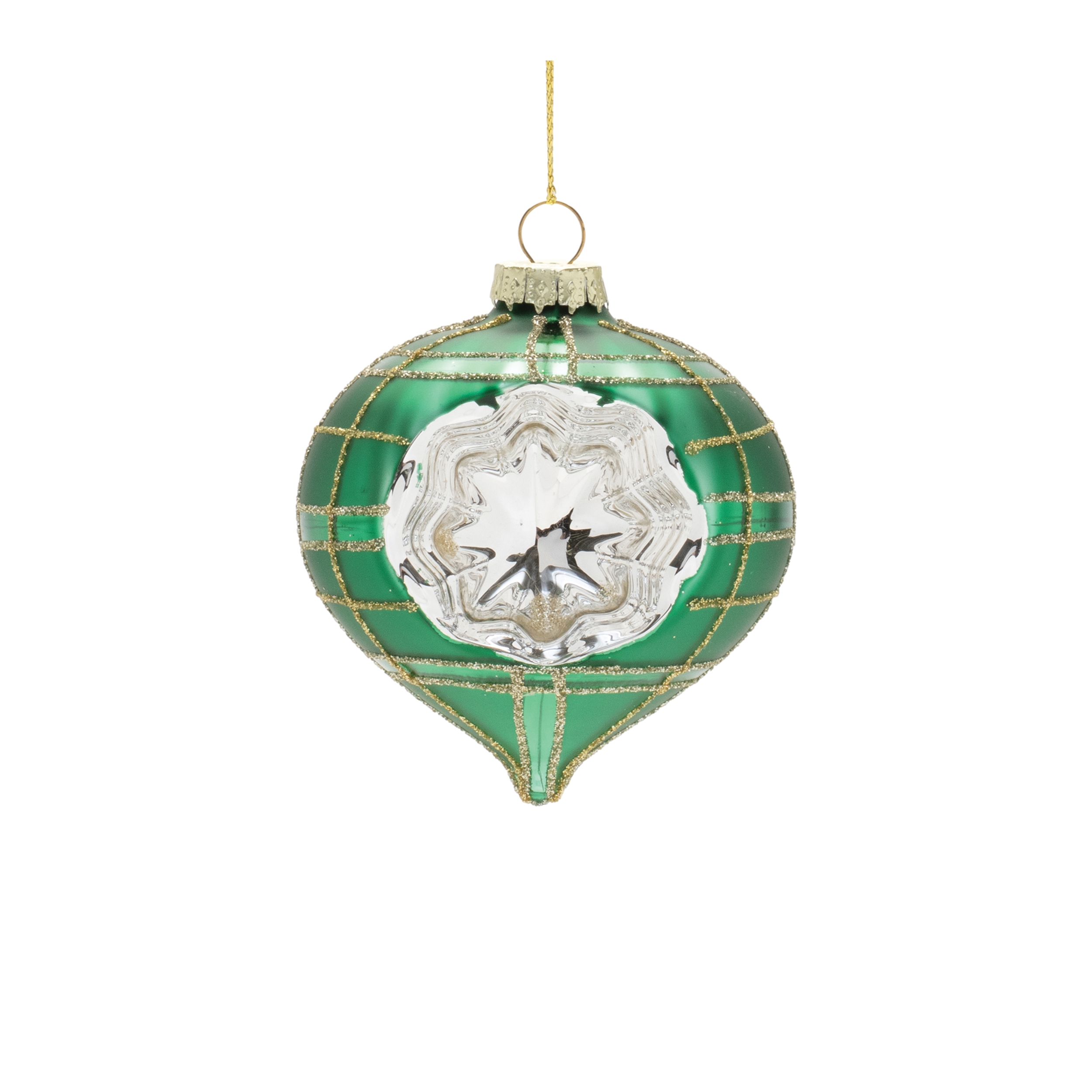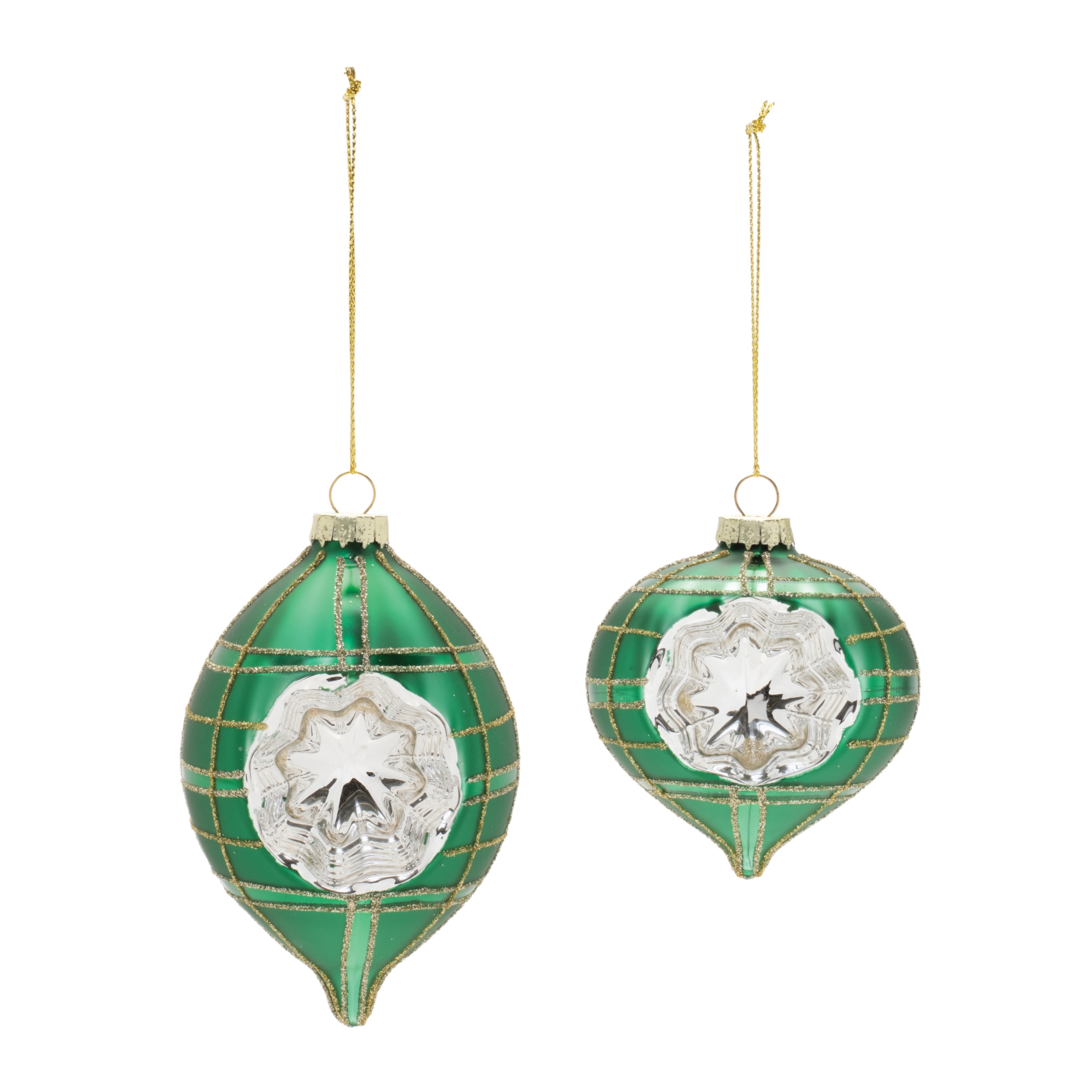 Bring retro charm and brilliant shine to your holiday tree with this set of green reflector glass ornaments. Featuring a classic indented center with shimmering silver detail and gold glitter accents, these ornaments blend nostalgic design with elegant sparkle. Each set includes a mix of two traditional shapes in coordinating finishes, perfect for vintage-themed or classic holiday d cor.
