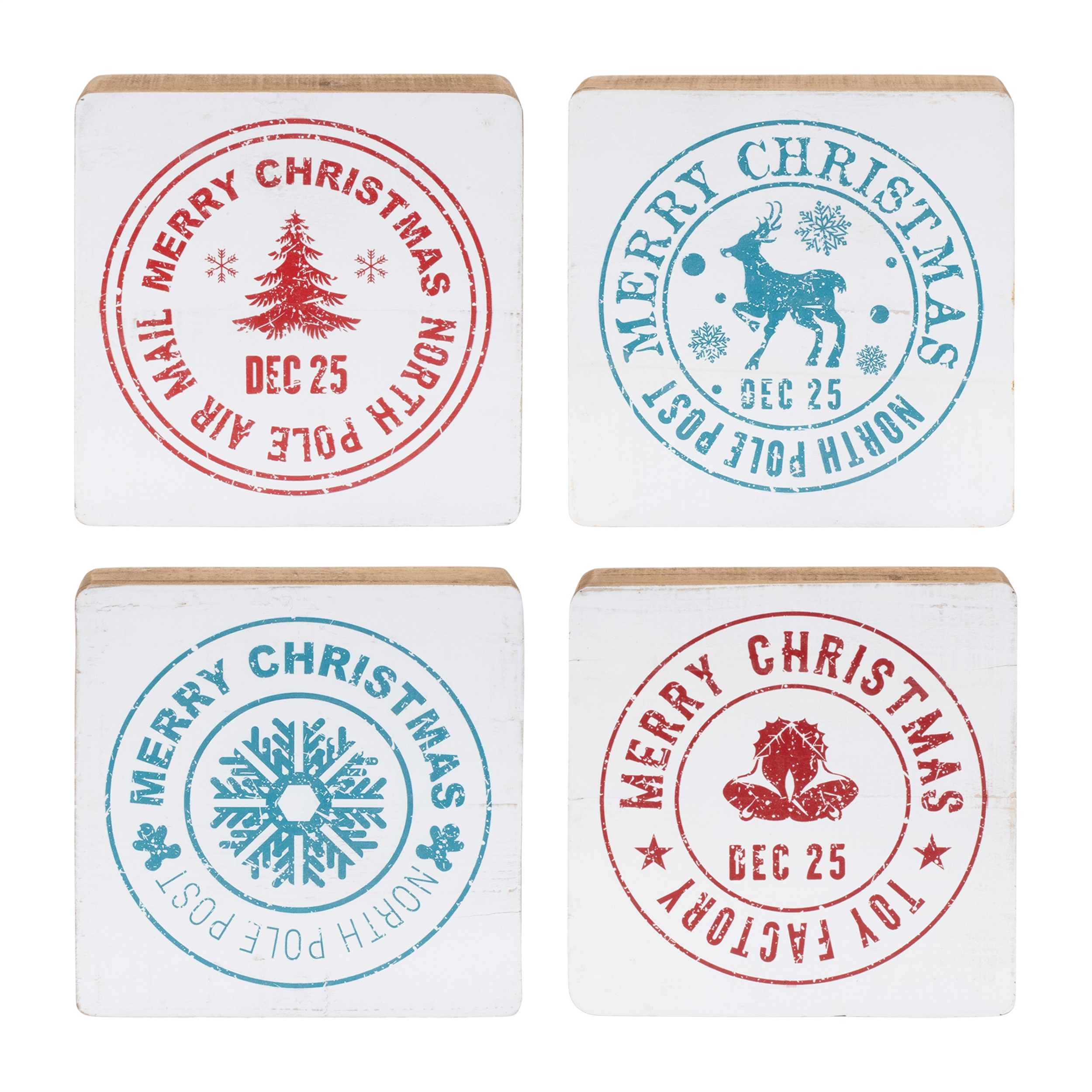 Celebrate the festive season with this charming Set of 4 Wooden Christmas Postal Stamp Signs. Each 7.5 inches tall, these rustic wooden pieces feature classic holiday stamp designs in vibrant red and blue hues, perfect for adding nostalgic cheer to your mantel, walls, or holiday displays. Crafted from durable wood, these decorative signs bring warmth and vintage style to any seasonal d cor setting.