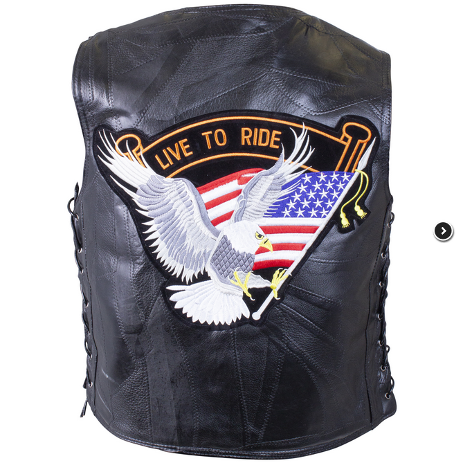 The Diamond Plate™ Rock Design Genuine Buffalo Leather Vest features an impressive Live To Ride® Brand Embroidered Eagle Patch already sewn in place on the back of the vest. Firm but supple genuine buffalo leather keeps your torso warm while allowing you maximum control of your bike without the weight and drag of a coat. Good quality and durable construction combine for an expensive looking vest. Fashionable top stitching accents, 4 slash pockets, quality side ties lace through eyelet holes, and black finish snaps close the front.