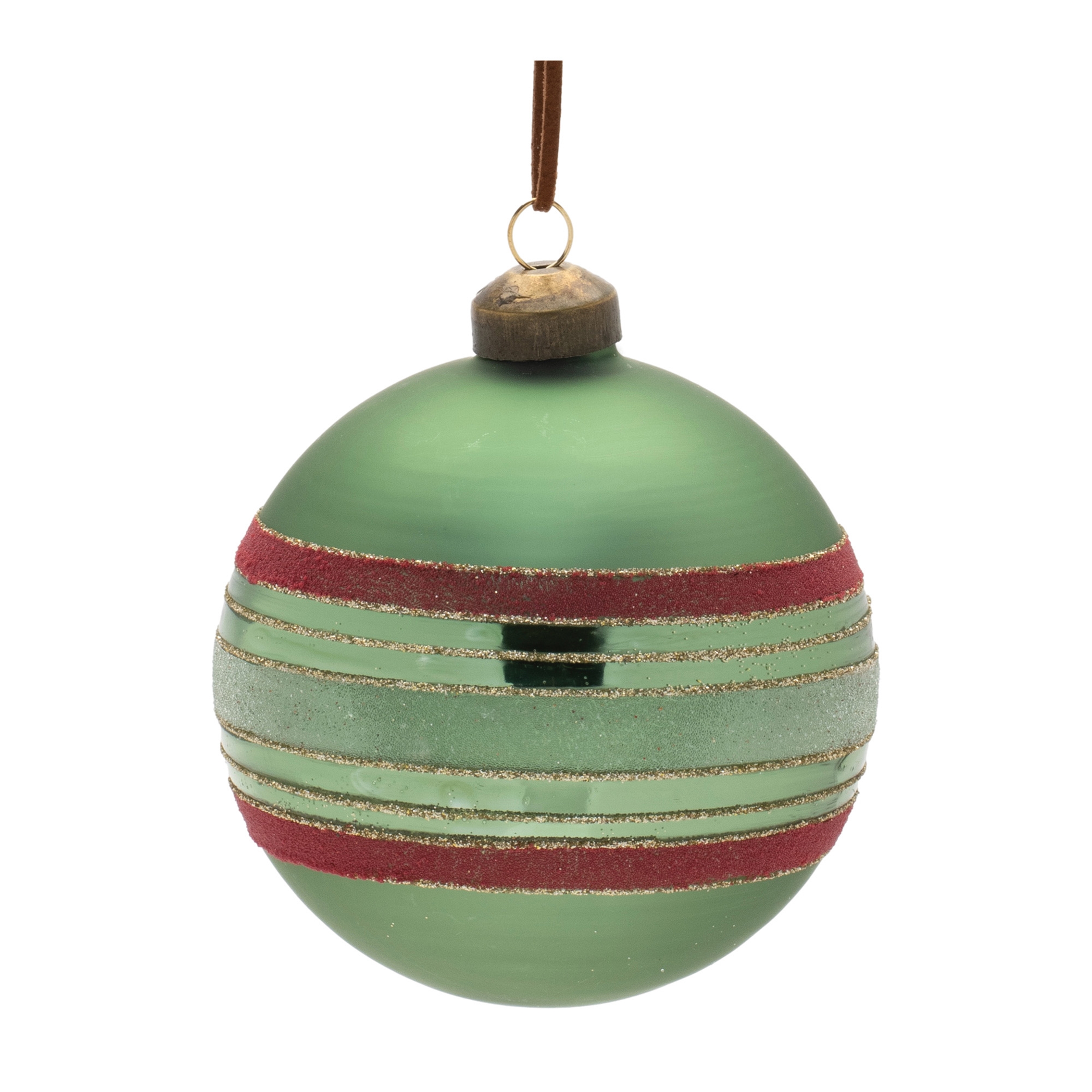 Bring a burst of traditional holiday cheer to your seasonal displays with the Striped Glass Ball Ornaments. Featuring festive red and green tones with chic glittered accents, these traditional ball-shaped ornaments are finished with a frosted glass texture and a bold striped pattern. Complete with a bronze ornament cap and delicate leather cord hanger, these ornaments are perfect for enhancing your Christmas tree or adding a pop of color to your wreath and mantle garlands. Sold in a set of 6, they re a must-have for creating a festive, classic holiday look.