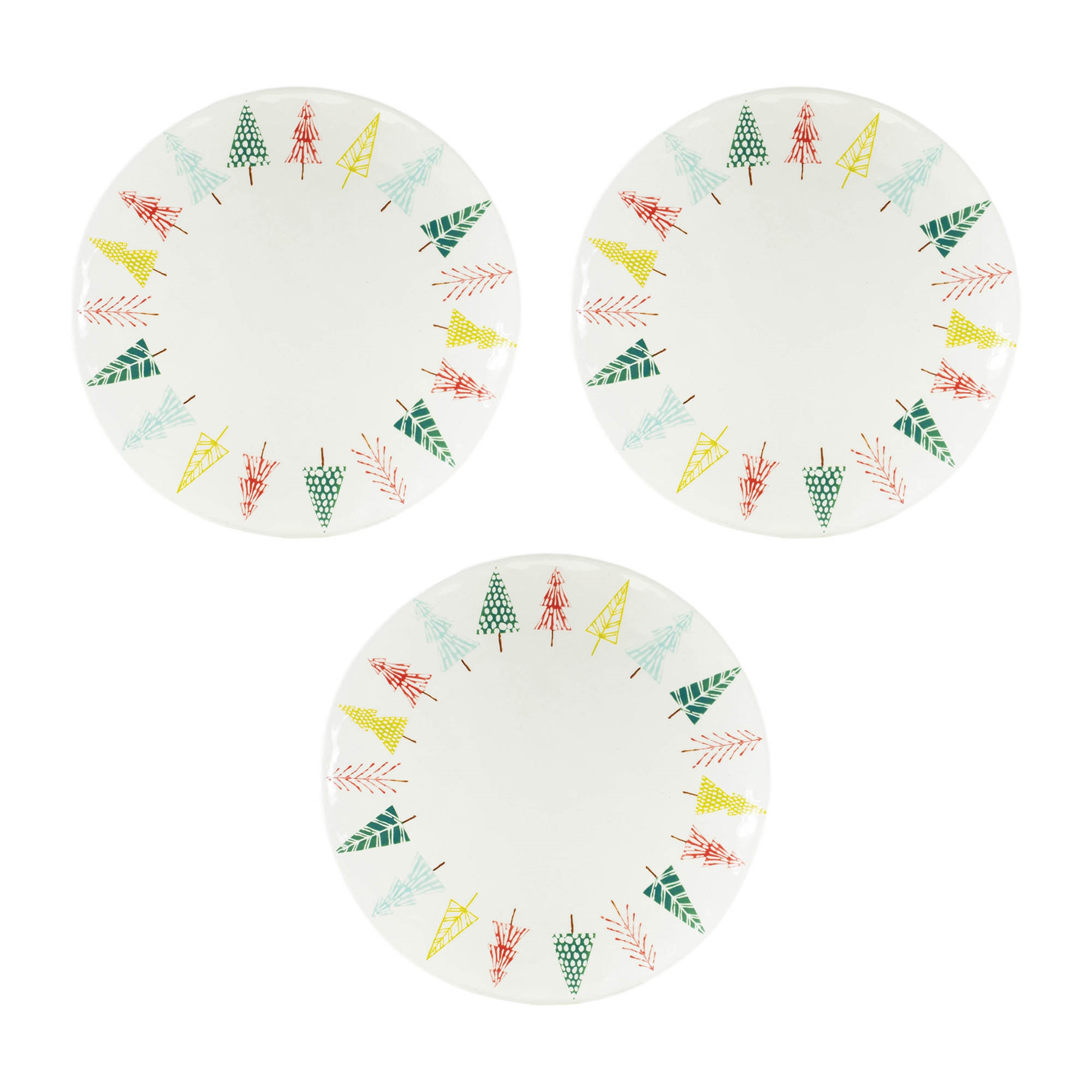 Celebrate the season with this Ceramic Pine Tree Print Platter Set. Featuring modern pine tree artwork in festive red, green, and blue tones, these platters add a touch of seasonal elegance to your holiday gatherings. Whether you're setting out Santa s milk and cookies on Christmas Eve or filling them with sweet treats for guests, these platters with a smooth glazed finish are the perfect addition to your Christmas tabletop decor. Sold in a set of three matching platters, they re ideal for holiday entertaining and gifting.