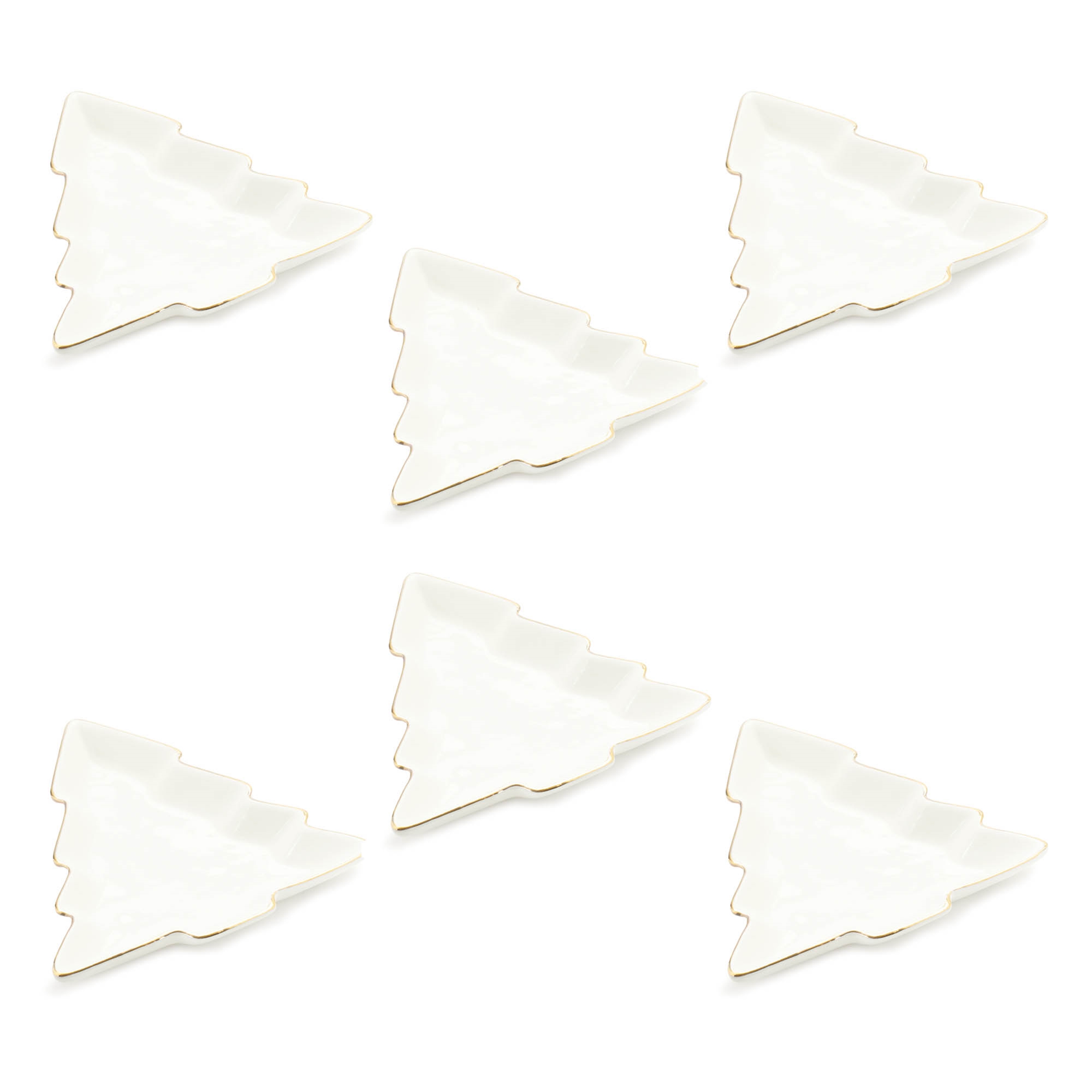 Add a touch of elegance to your holiday decor with this Ceramic Pine Tree Trinket Dish Set. Featuring wintry white tones and chic gold trim, each dish is shaped like a traditional pine tree, creating a sophisticated seasonal look. The perfect size for holding your favorite holiday trinkets or sweet treats, these dishes are a great way to entertain guests at your winter events. Sold in a set of six matching pieces, these charming dishes are both functional and decorative, adding festive flair to your holiday gatherings.