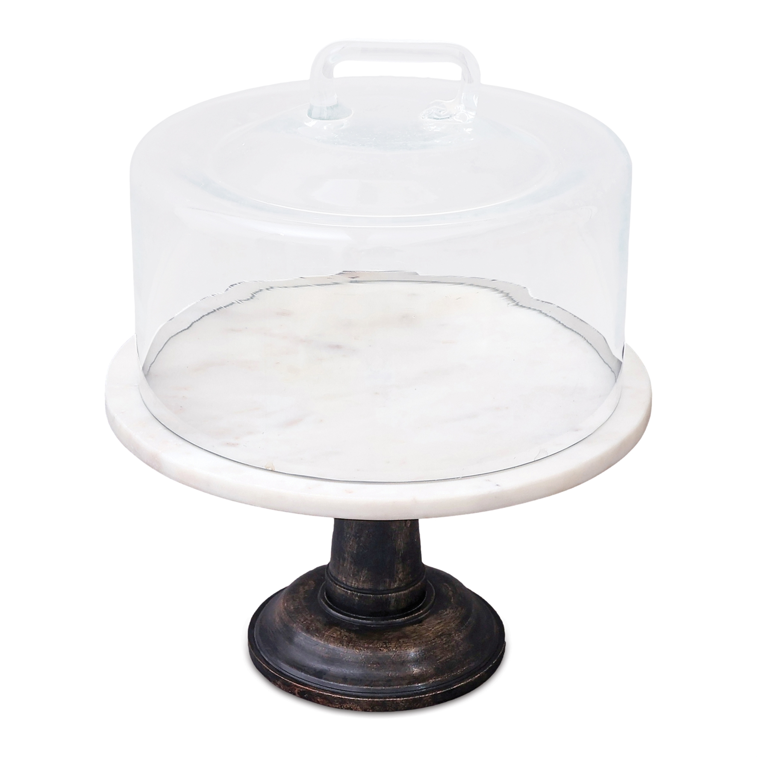 Elevate your dessert display with this Marble Pedestal Cake Stand with Cover. Featuring a sleek black and white design with a natural marble stone finish on the tray top, this cake stand exudes modern elegance. The dark wood grain tapered base adds a touch of sophistication, while the delicate glass cover keeps your cakes and sweets fresh for your guests. Perfect for serving cakes, pastries, or even as a decorative centerpiece, this cake stand brings a contemporary flair to your kitchen or dining table.